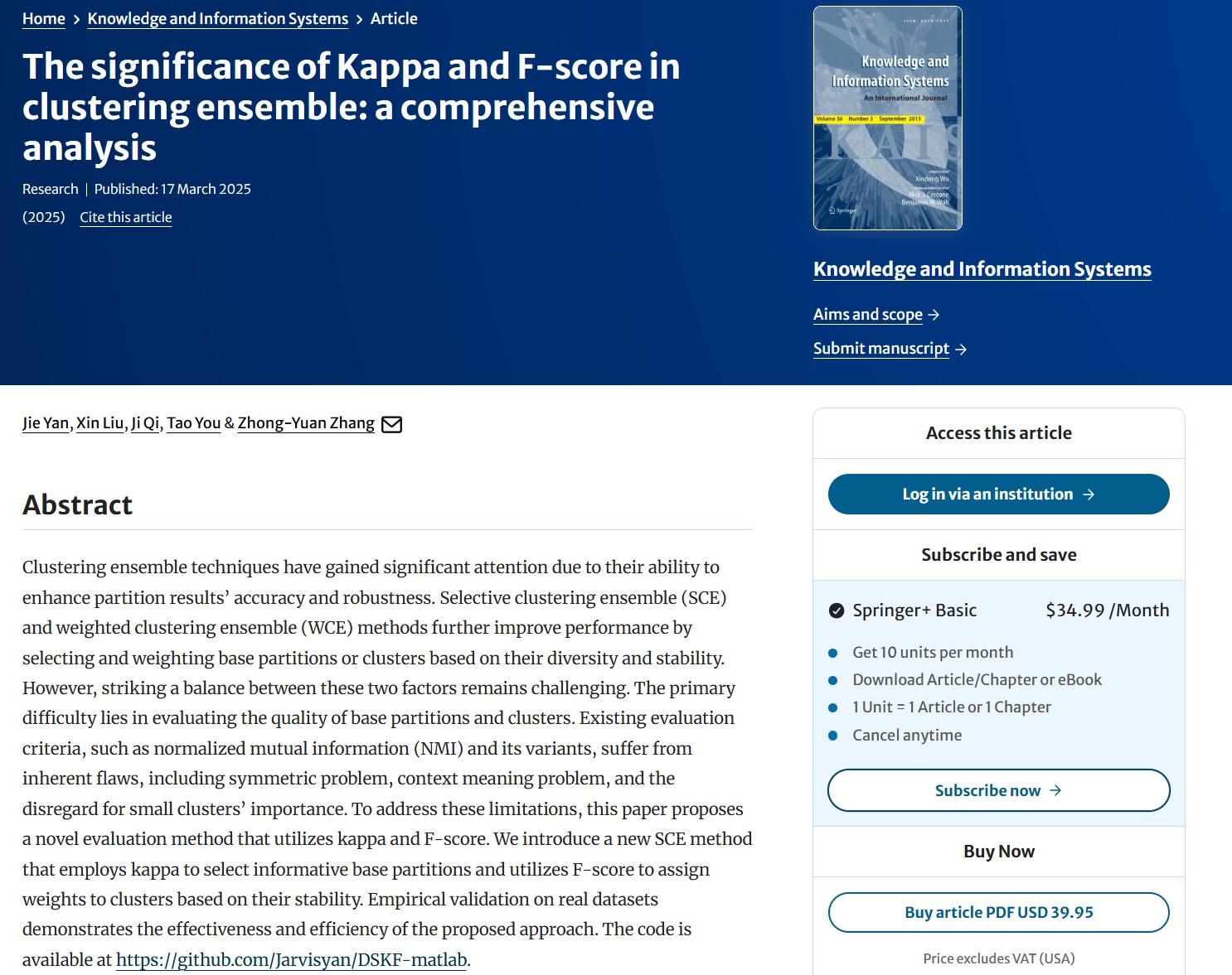 成果速递第11期:Kappa 和 F-score 在聚…2025-03-20张忠元教授及其博士生团队在公司AAA级期刊Knowledge and Information Systems上发表了关于Kappa和F-score在聚类集成中重要性的系统分析论文。传统单一聚类方法通常基于特定的数据分布假设,且对超参数设置、初始化条件以及数据中的噪声…